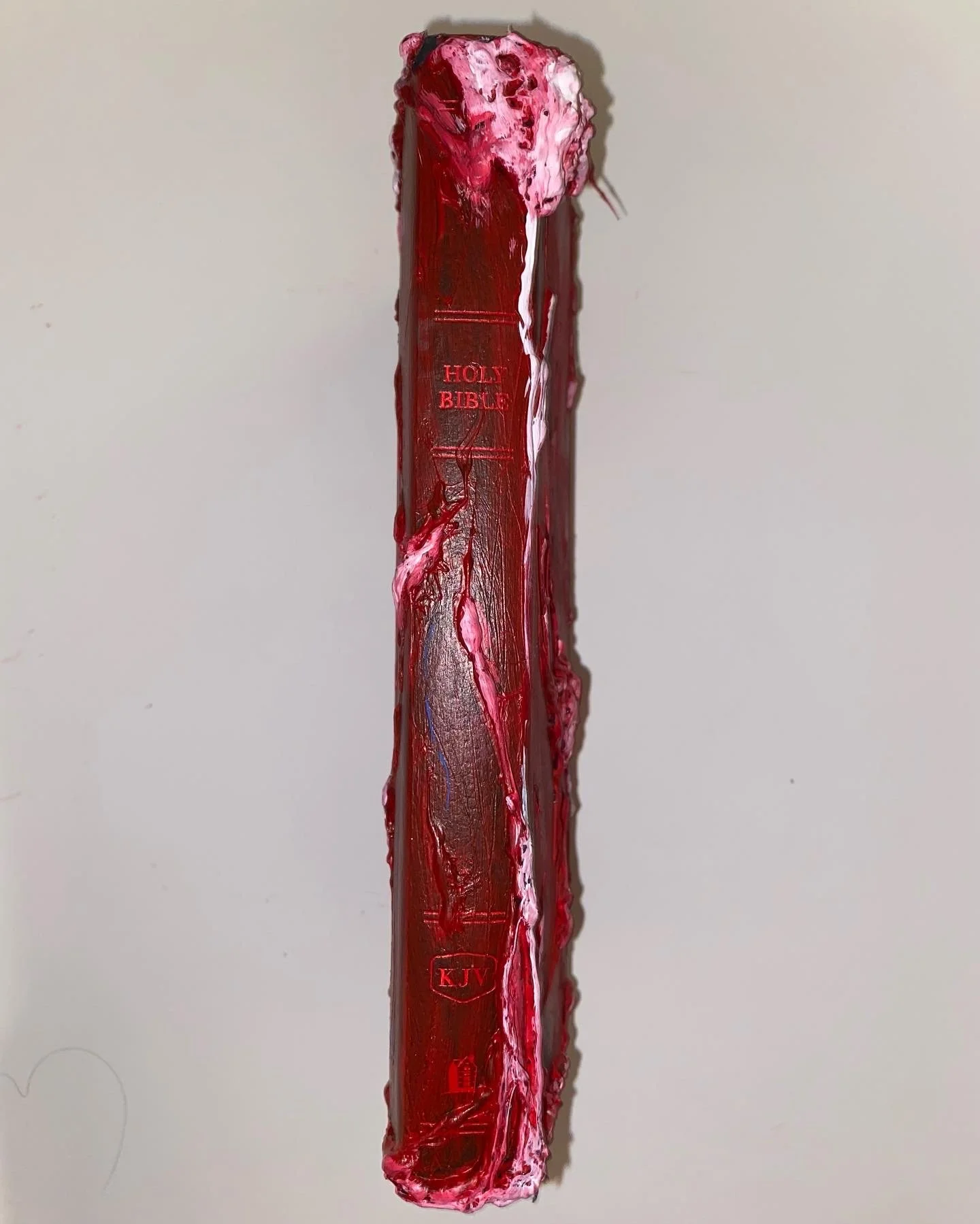 "Last Supper" - Front, Bible, hot glue, cotton balls, acrylic paint, ink, bakers twine (2022)